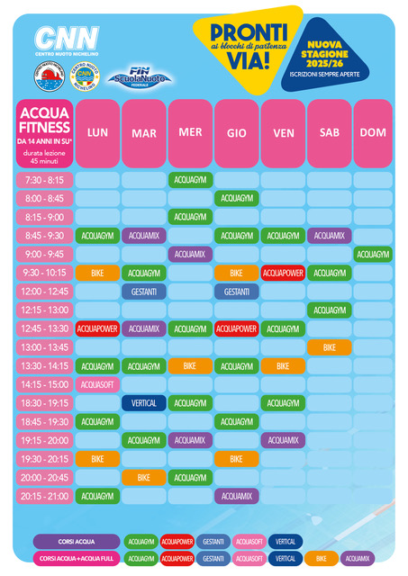 | 20:15 – 21:00 | Acquagym | – | – | Acquamix | – | – | – |